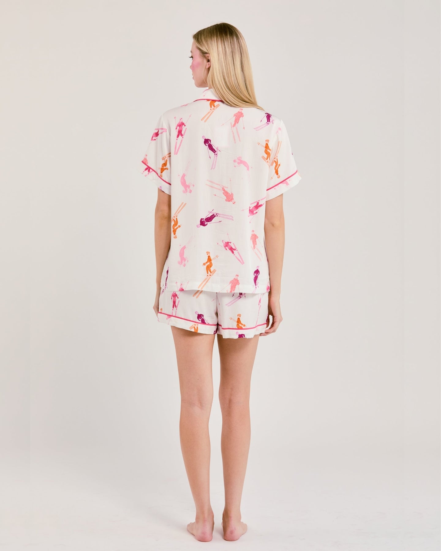 Our Women’s Pajama Shorts Set — is cut in a timeless silhouette with classic piping detail. The shorts’ elastic waist and adjustable ribbon tie ensure a custom, universally flattering fit. Add a bespoke touch with your choice of monogram.
