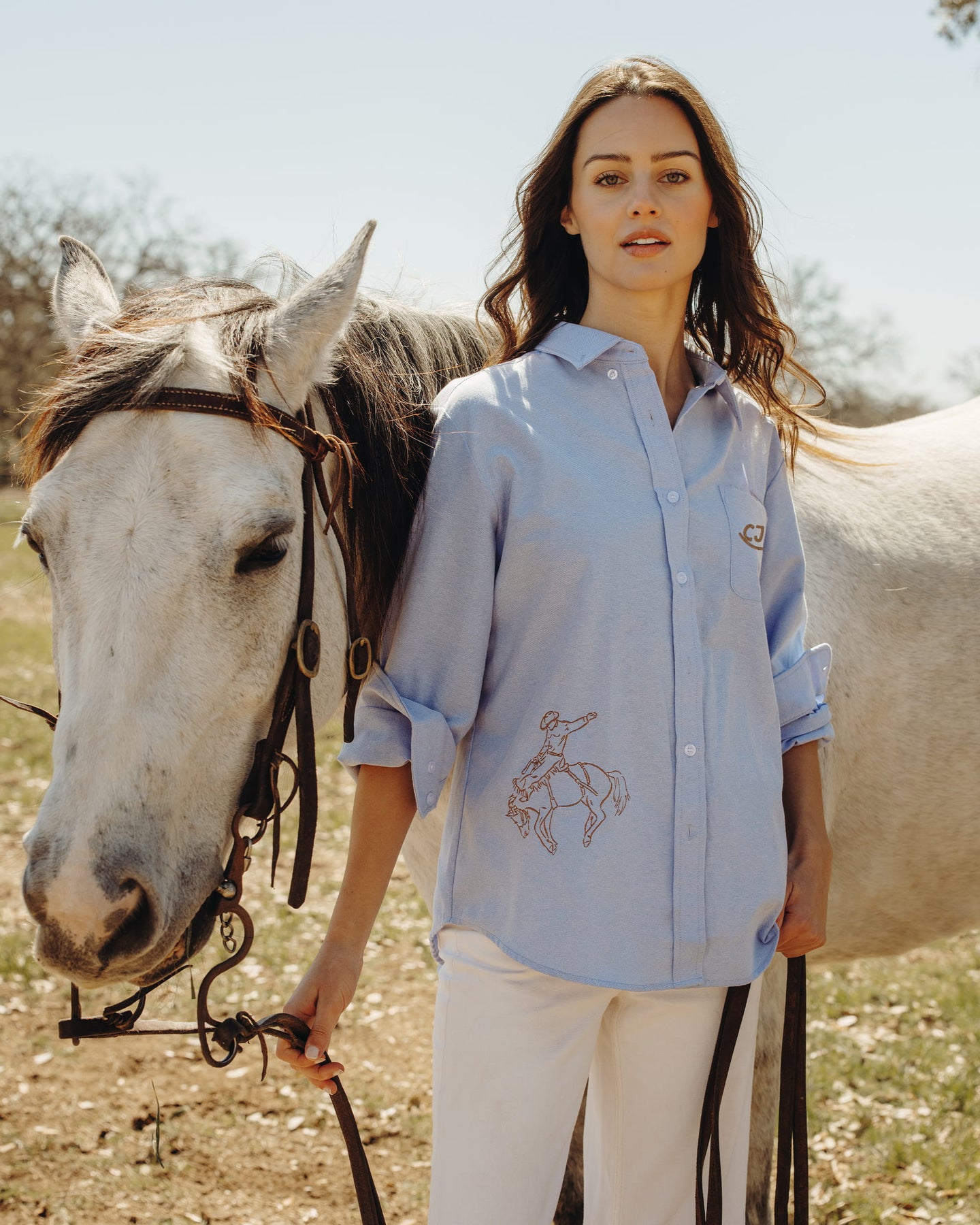 Inspired by the classic Oxford, the Ranch Oxford with its embroidered bronco and rider and our signature ranch monogram in rich chocolate thread add a western nod to this preppy classic. Designed with a button-down collar, front button placket, and oversized chest pocket, it’s made from our custom-milled cotton-blend fabric that softens with every wear.