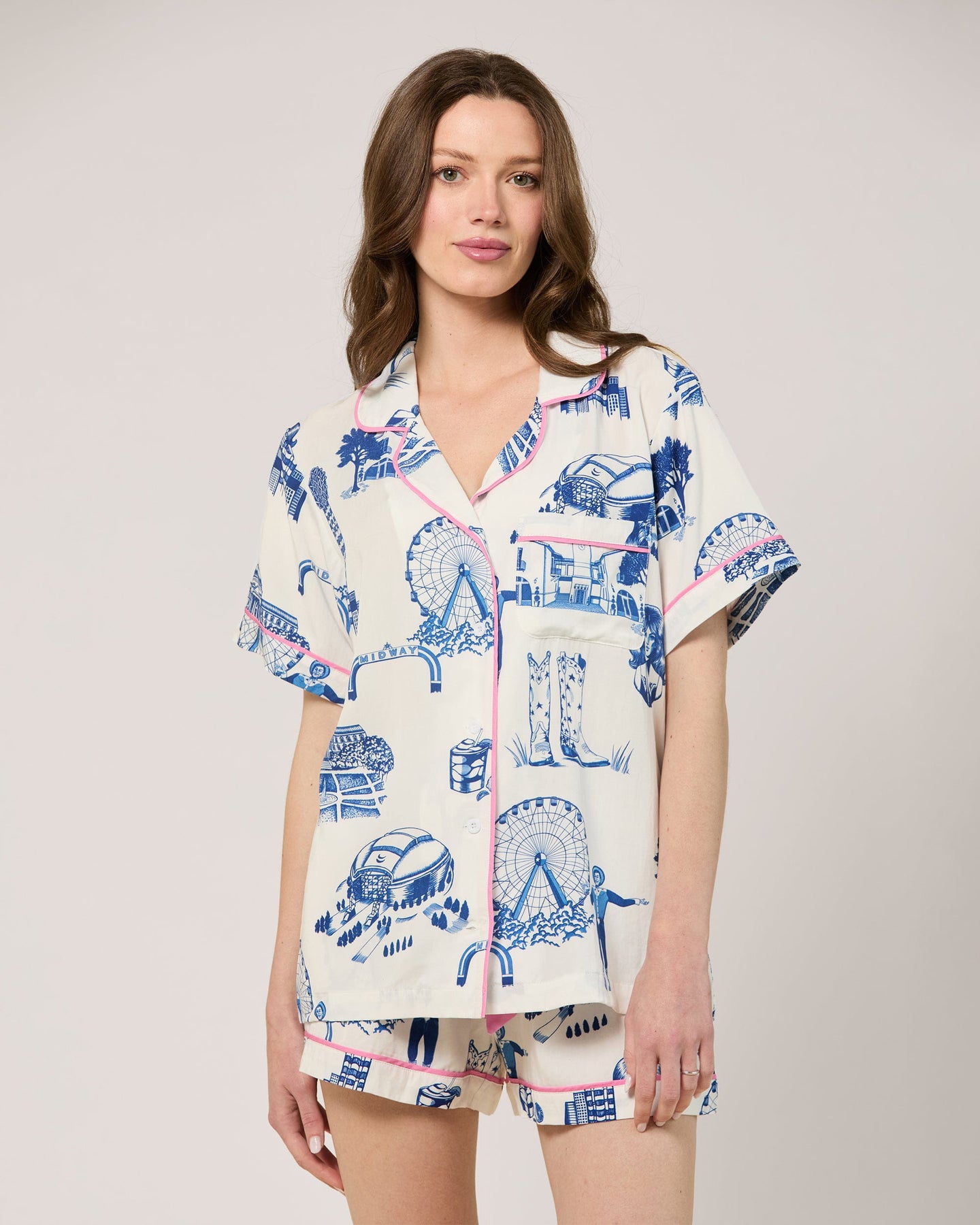 Our Women’s Pajama Shorts Set — is cut in a timeless silhouette with classic piping detail. The shorts’ elastic waist and adjustable ribbon tie ensure a custom, universally flattering fit. Add a bespoke touch with your choice of monogram.